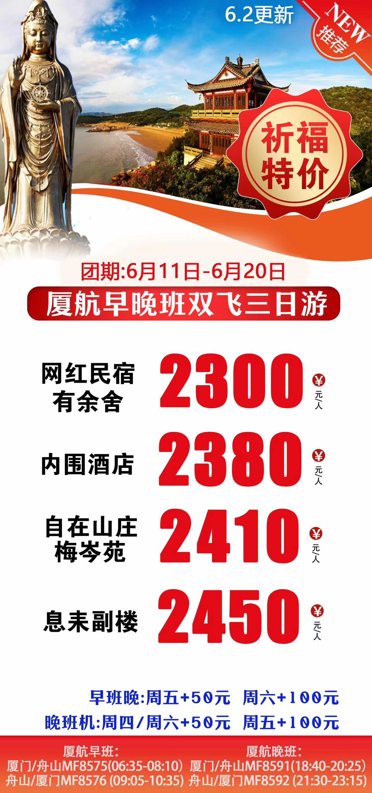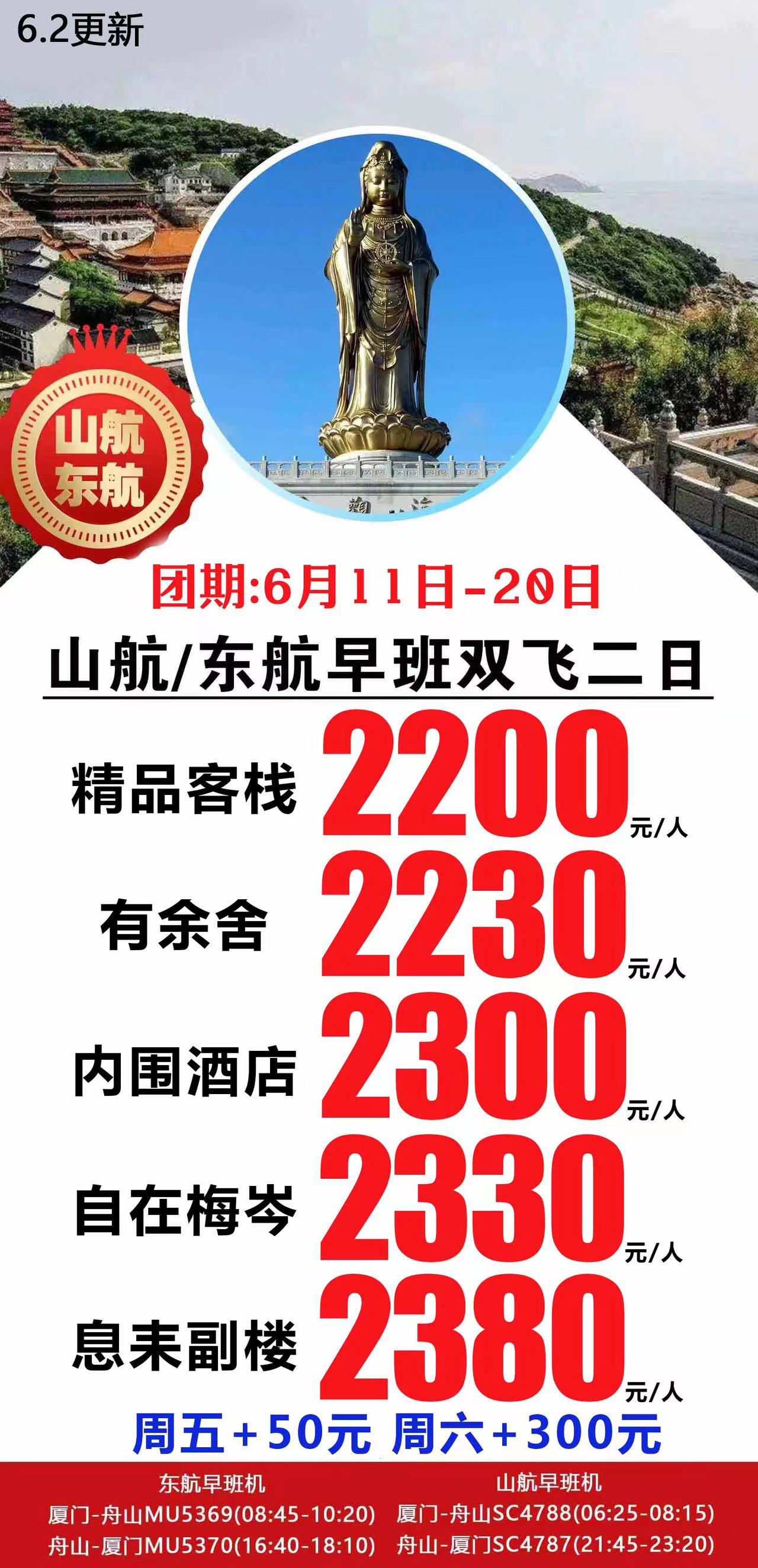 2023年6月11-20号厦门出发 普陀山山航东航2天价格