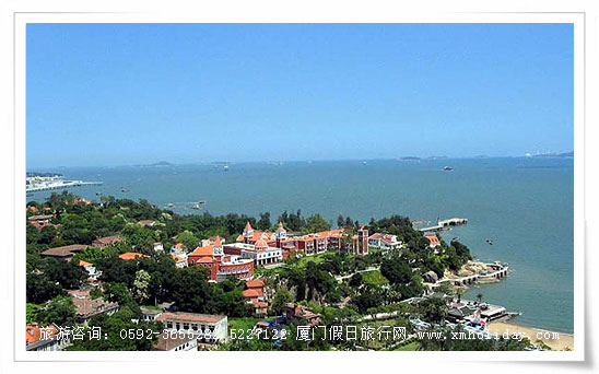 鼓浪屿是厦门西南禺的一座小岛,面积1.77平方千米,以700米宽的海峡与市区相隔。岛上四季如春,岛上树木丛生,丘陵起伏,有海上花园的美称,是闻名中外的旅游胜地,因为岛上有一中空巨石,海浪拍击声如鼓鸣而得名。岛上最高处叫日光岩,附近有民族英雄郑成功当年训练水师的水操台遗址。海边有菽庄花园,花园旁边的金色沙滩,为天然海滨浴场。岛上无车辆,清雅脱俗。尤为游人所赞赏的是,此地的居民文化素质非常的高,钢琴拥有量为全国第一。月下风中,琴声悠扬,漫步其间,韵味无穷,给人以极其优美的艺术享受。