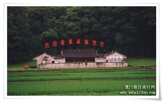 古田会议纪念馆位于福建省龙岩市上杭县古田镇,是介绍古田会议历史及其意义的专题革命纪念馆,建于1964年。全馆占地面积8.6万平方米,建筑面积1.1万平方米,拥有馆藏文物11000多件,其中珍贵文物2000多件,为福建省文物数量最多的革命纪念馆。陈列馆建于1972年,有10个陈列室;陈列展览展线长306米,展出文物400多件,内容分为三部分:一是古田会议召开的历史背景、二是光辉的古田会议决议、三是古田会议永放光芒。 古田会议纪念馆为市属副处级事业单位,现有编制40人,工作人员60多人,下设文物资料科、陈列宣传科、保卫科和办公室,管辖古田会议会址、中共红四军前委机关暨红四军政治部旧址耕心堂、红四军司令部旧址中兴堂、毛泽东《星星之火可以燎原》写作旧址协成店、中共闽西第一次代表大会会址文昌阁、中共闽西特委机关旧址树槐堂、红军哨所旧址文光阁等7处文物保护单位。 40年来,古田会议纪念馆始终坚持高举革命传统教育的旗帜,弘扬爱国主义主旋律,在社会主义精神文明建设中发挥了重要作用,累计接待观众400多万人次,其中包括胡锦涛、江泽民、温家宝、贾庆林、曾庆红、吴官正、李长春等40多位党和国家领导人,取得了显著的社会效益,先后被授予“全国文化工作先进单位”、“全国首批十大优秀社会教育基地”、“全国首批百家爱国主义教育示范基地”、“全国爱国主义教育示范基地先进单位”、“福建省一级达标纪念馆”等殊荣。