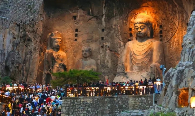 后车赴洛阳龙门,参观世界文化遗产、中国三大石窟艺术宝库之一【龙门石窟】(游览2小时),现存龛窟两千多个,造像十万余尊,造像之丰富、技艺之精湛位于中国各大石窟之首,依次参观潜溪寺、摩崖三佛龛、万佛洞、莲花洞、奉先寺瞻仰17.14米卢舍那大佛。