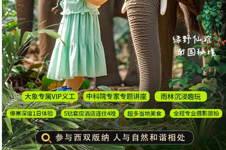 【住】无 【餐】酒店早餐、野象谷象餐或桌餐 -【活动地点】野象谷 - 上午:【大象粪便分析】戴上手套,拿起工具,跟导师一起,从大象粪便里 “读” 出雨林生态小秘密 ! 【制作大象营养球】挽起袖子,和小伙伴们把新鲜果蔬巧妙搭配,亲手为大象制作专属营养球! - 下午:大象亲密互动(活动一:大象体检+喂食大象或活动二:雨林牧象+喂食大象),活动结束后,结营返程统一送机送站。 【大象体检】穿上防护衣,跟随导师开启大象健康探秘,为大象的身体状况 “把脉问诊” !或【雨林牧象】跟随象夫的脚步,踏入雨林开启牧象之旅,与大象一同漫步,邂逅自然之美 。 【喂食大象】捧起新鲜的蔬果,近距离接触大象,看它用长鼻温柔 “取食”,超治愈! 根据大象保育员项目特殊性或其他不可抗力因素,项目时间或行程安排可能会有所调整,敬请理解。活动结束返程航班时间建议购买18:00后航班,如时间过早可能会错过大象亲密互动。 注: 10人以下傣寨泼水及象脚鼓舞替换为抓鱼、达瞭、傣纸体验;基诺非遗体验替换为原始森林公园门票+电瓶车体验。