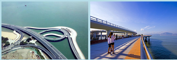 【11:30】【演武大桥观景平台】 环包于演武大桥演武路立交的外侧,由三座栈桥和一处观景平台构成,和演武大桥通体洁白的鱼腹式风格一致,可观轮渡、海沧、鼓浪屿及漳州港之景,听浪鼓岩壁。