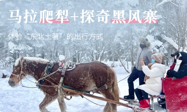 【天了噜?!体验“东北土著”的出行方式—马拉爬犁】+【探奇黑风寨】穿林海过雪原、沿途可看到抗联遗址土匪窝、地窨子等东北特有的习俗,咱也做回抗联人,也许在你毫无准备时会有“土匪”窜出,劫了您的“财宝”充实了他们寨子的金库。进行互动游戏,土匪抢亲,参观土匪窝、地窨子,威虎山寨对黑话,“天王盖地虎,小鸡炖蘑菇”。入寨大碗酒,摔碗拜山头,穿上狗皮帽子,狗皮大衣,扛起大刀穿上土匪服装、模仿大姑娘叼着烟袋拍照留念,参观土坯房,了解东北八大怪。
