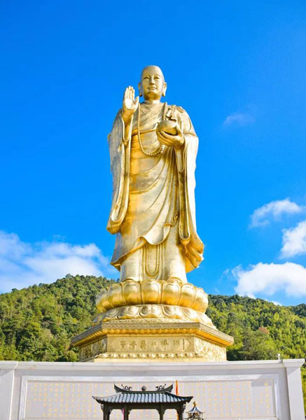 仰盛广场上的三平祖师铜像,身高为18.8米,包括莲花底座总高度为22.88米。作为三平祖师文化园的标志性建筑,三平祖师铜雕像开光后,数千信众涌上文化园顶部瞻仰膜拜。
