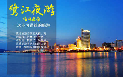 鹭江夜游游客能够在夜幕下欣赏到更加婉约的鼓浪屿,以及千变万化的鹭岛夜景。它将演武大桥、海沧大桥、杏林公铁大桥三点相连。闲暇之余游客可到船上一楼欣赏弹奏乐和吹萨斯表演、观看漳州木偶戏,演员们还会和观看者互动,观景品茶赏歌,十分惬意。